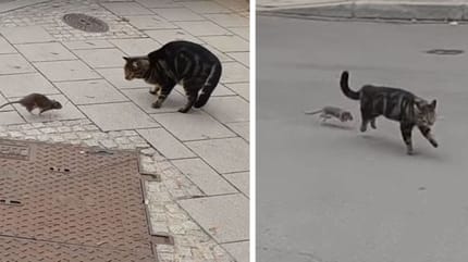 Zauważył prężącego się kota, który ewidentnie przymierzał się do polowania na coś, co stało po drugiej stronie ulicy. Claude, podejrzewając, że za chwilę może zrobić się gorąco, wyjął telefon z kieszeni i zaczął nagrywać.